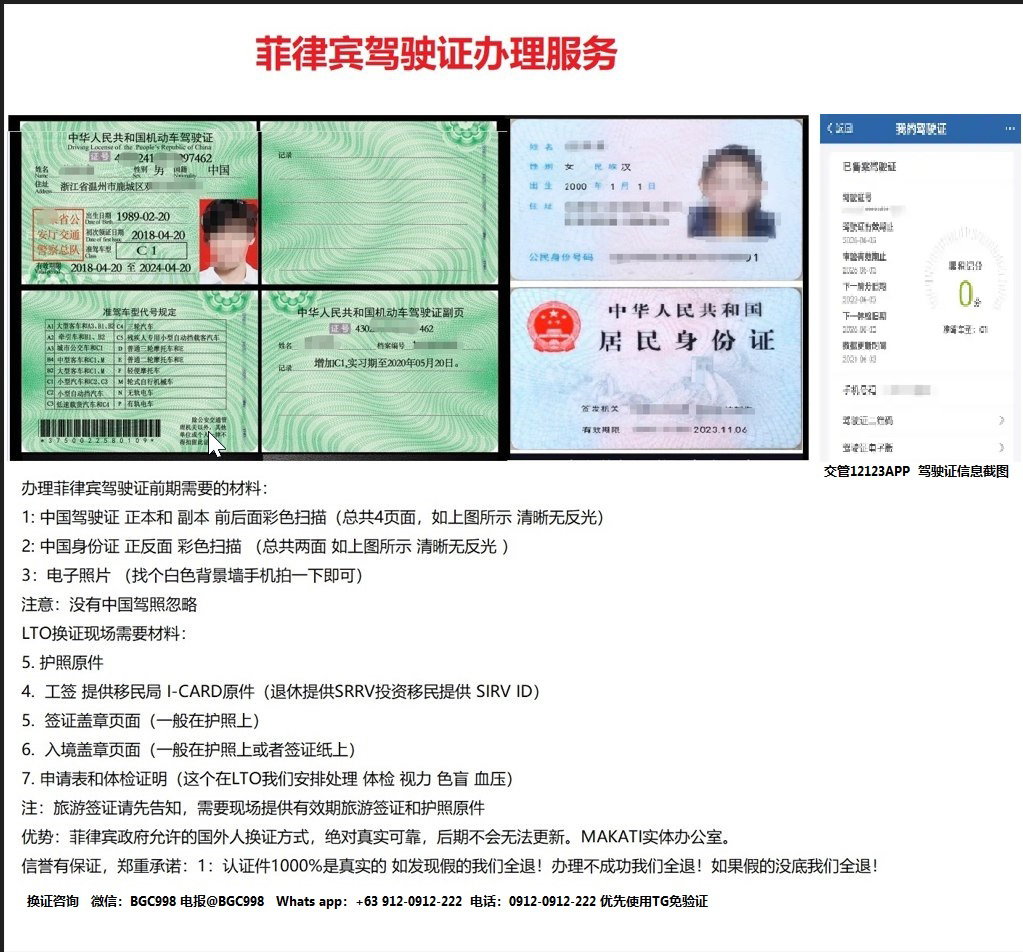我们专业代办菲律宾驾驶证各种业务 换证 新办 过期换新 等等服务 需要的可以联系我们想了解更多最新信息欢迎联系和咨询我们,微信:BGC998 电报@BGC998 Whats app:+63 912-0912-222 电话:0912-0912-222 优先使用TG免验证,咨询请主动告知咨询项目,菲律宾MAKATI 实体公司,客户 隐私保护 安全 可靠,可以安排工作人员上门取件或前往我们办公室提交办理业务。