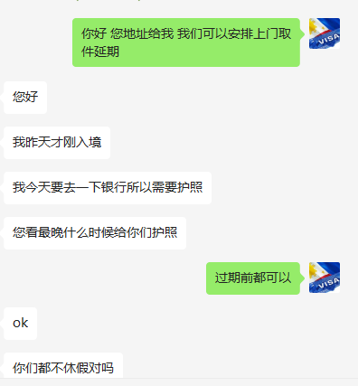 菲律宾签字延期(免签入境7天)使用 美国 加拿大 澳洲 申根 日本等发达国家签证 落地菲律宾的可以入境7天免签,7天后可以延期14天 合计在菲律宾停留21天, 延期费用含服务费大概是4-5000比索。客人 提供地址 电话 大马尼拉范围内我们上门取件,通常1工作日能完成送回护照。
