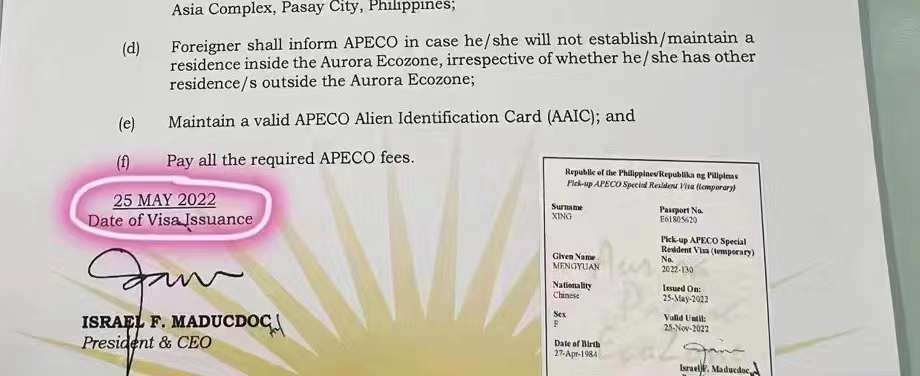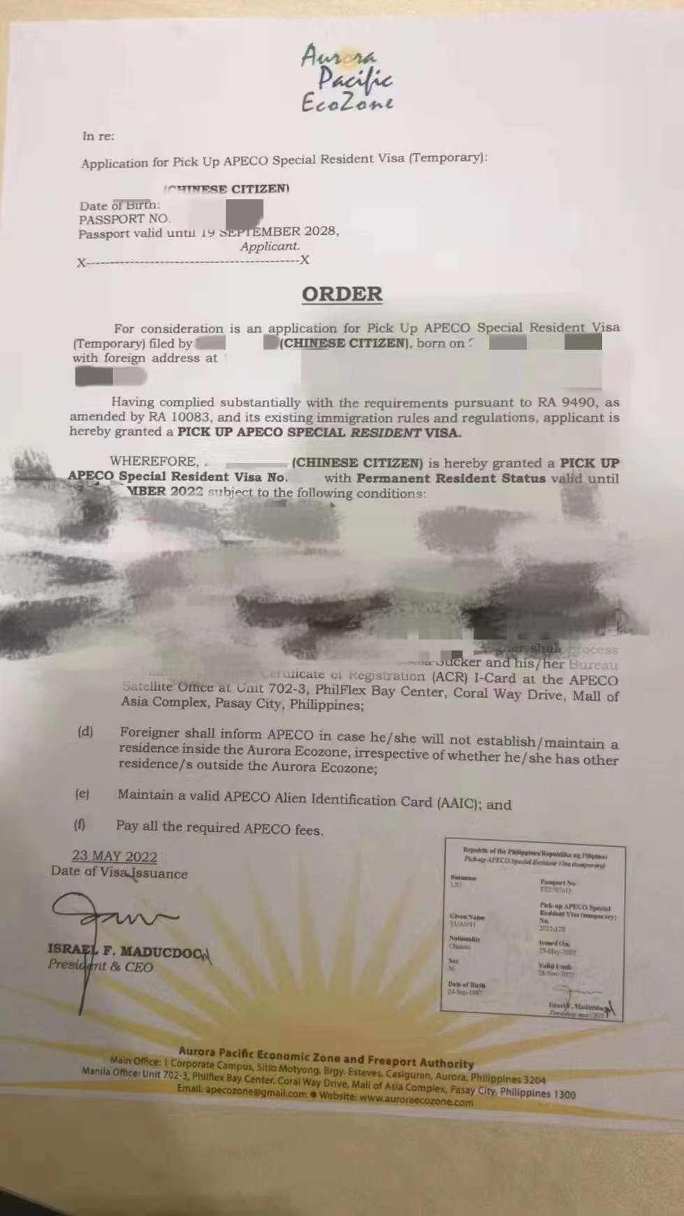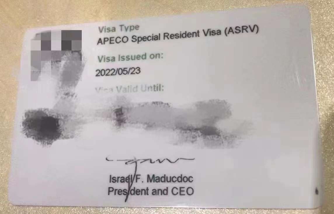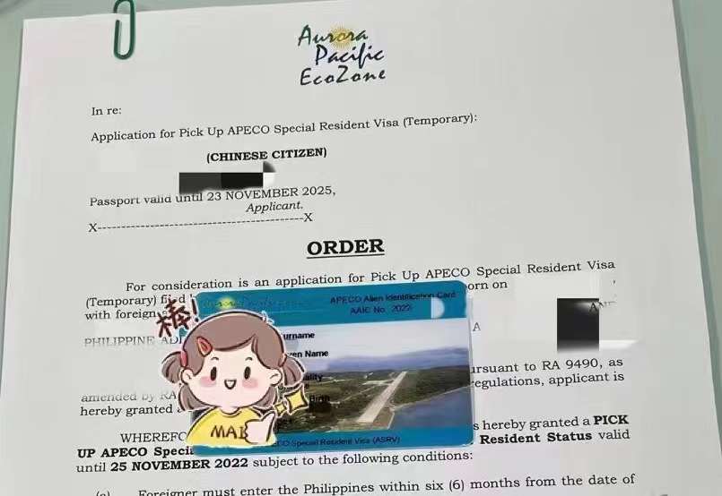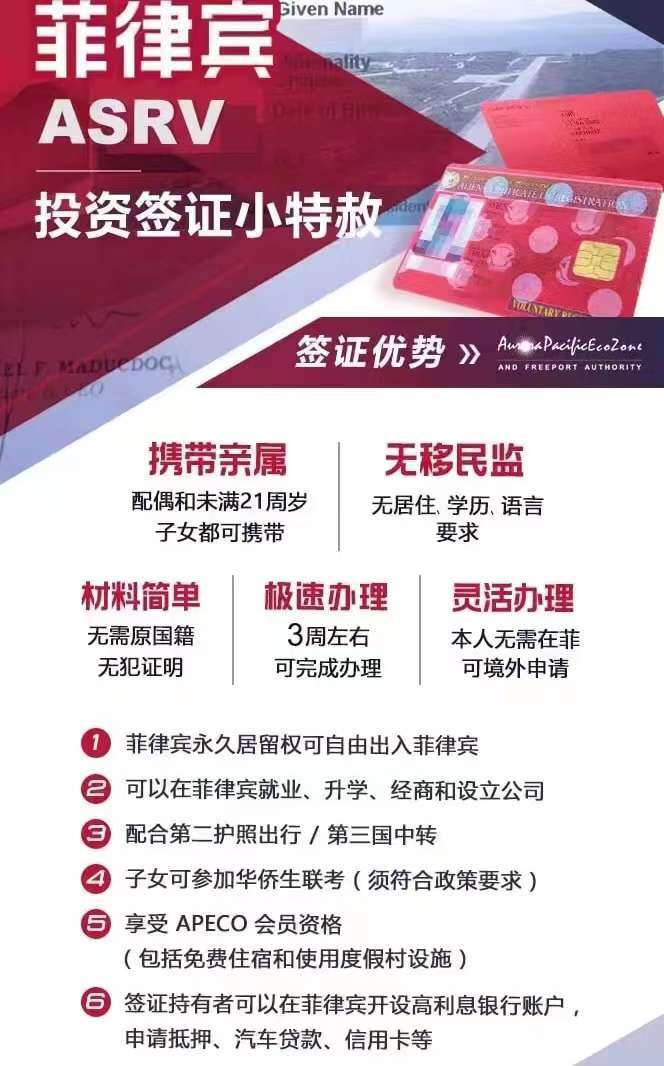 12、目前受理不需要出生地无犯罪记录。最重要的是,人不在菲律宾也可以办理! 此项目于2016开始,但是针对日本人和韩国人开放。但是2019年开始,中国籍也可以申请了。目前Aurora经济特区在移民局(BI)和劳工署(DOLE)承认的签证种类为以下几种:1、APECO Special Resident Visa (ASRV); APECO特殊居民签证 就是小特赦2、APECO Special Investor’s Resident Visa (ASIV); APECO特殊投资居民签证3、 APECO Working Visa (AWV); APECO工作签证4、APECO Dependent’s Visa (ADV); APECO家属签证5、APECO Special Work Permit (APECO-SWP); APECO特殊工作许可6、APECO Provisional Work Permit (APECO-PWP); APECO临时工作许可7、APECO Alien Identity Card (AAIC)。APECO外国人身份卡其中我们主要需要详细了解的是ASRV,ASIV,ADV。ASIV基础申请条件:A: 菲律宾经济特区投资金额:
